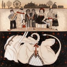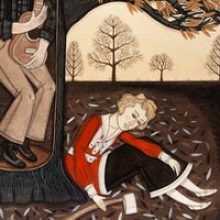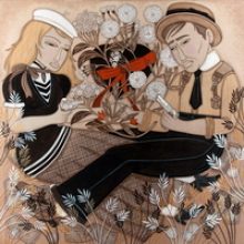 Born among the briars & brambles in backwoods of Medford, Oregon, Evan Benjamin Harris grew up with little knowledge of the bourgeois big city fine arts. So, he dove into the recesses of his own imagination and embraced the fables and folklore that fascinated him. With little to do but draw, he did exactly that. Now older, things haven’t changed much. The stories he created as a child are still present in his paintings. With diligence and hard work, Evan’s crude stick figures became the more clearly defined images you see today. With no formal art training, he creates on his own terms. Broken boards, oil and acrylic paints, charcoal pastels, plastic resign, and melted waxes are among the mediums Evan uses. Then they are beaten, brushed, sanded, polished, and hung. Most would cringe at the idea of scratching or sanding something they spent hours upon hours painting, but that’s Evan’s favorite part- creating the appearance that this wasn’t made in the 21st century, maybe in the 20th. So, behind every scratch and claw mark, there is a story to tell.
