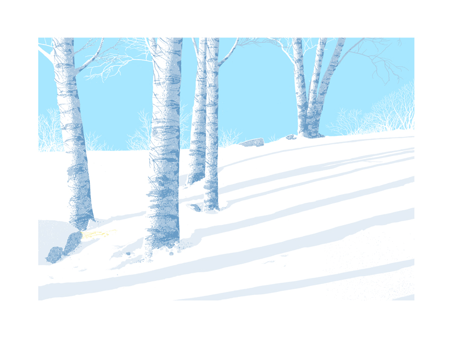Dan McCarthy lives and works in Massachusetts. He attended The School of the Museum of Fine Arts in Boston. His work usually starts with pen and ink drawing. He prints all of his work himself and is considered a master printer- familiar with etching, lithography, and screen printing. Dan’s work often incorporates overlooked things like telephone lines and poles. He often focuses on death and rebirth, usually manifested as skeletons in his work, and the external environment in the nighttime setting, usually as wooded silhouettes and shadows. Dan has also made posters for bands and television shows such as LOST and Wilco.