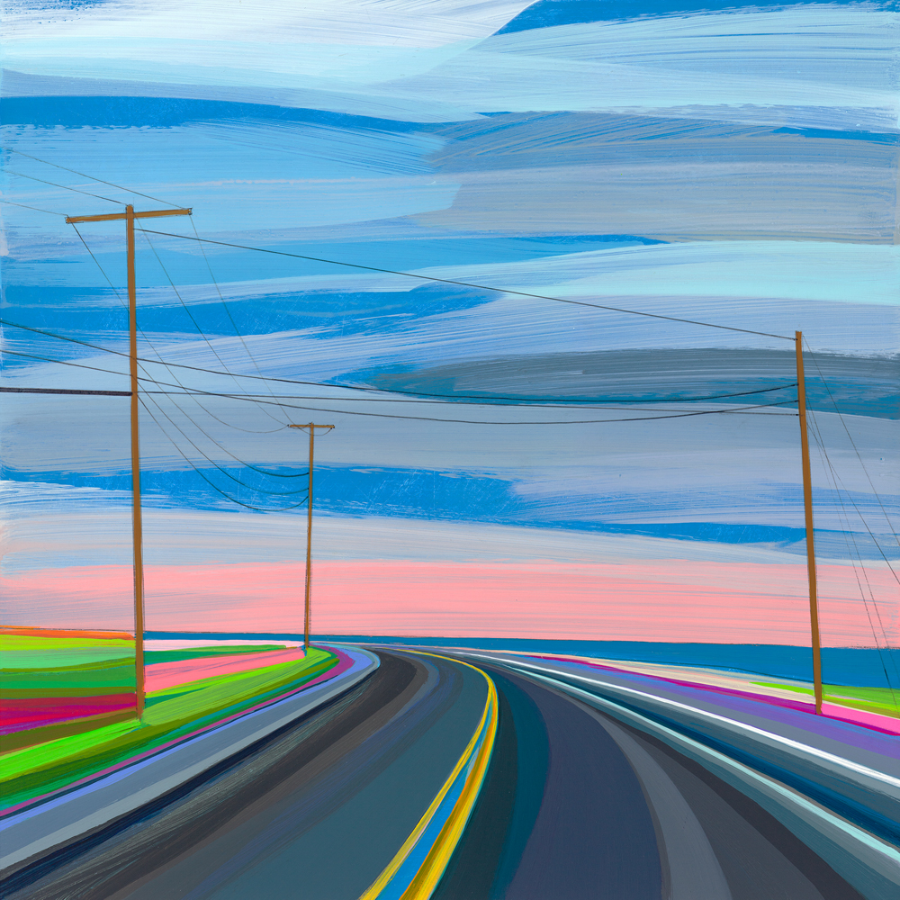Born in 1978, Grant Haffner has been a resident of the East End of Long Island, New York for most of his life. Haffner’s images are inspired by and reflect the country roads, flat landscapes and surrounding water that we all enjoy. His signature motif of utility poles with power lines creates an original sense of movement and depth to his distinctive, colorful compositions.