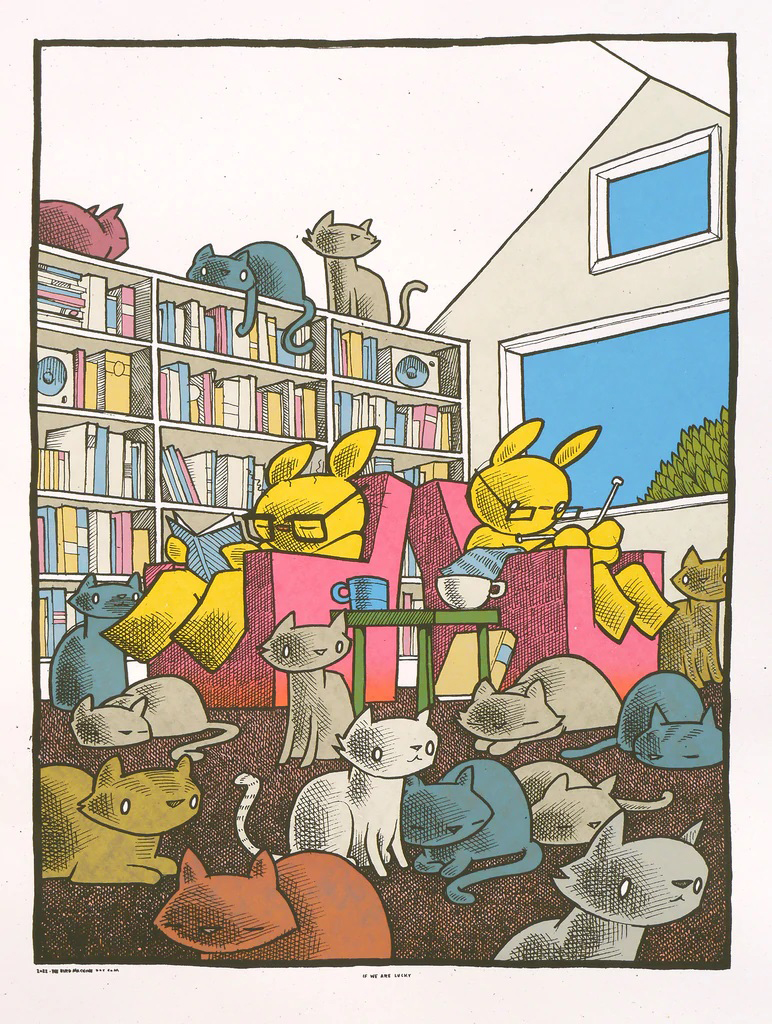 Jay owns and runs his own workshop, The Bird Machine . He began learning to screen print in 1995, working under Steve Walters at Screwball Press. Jay printed posters for his own band (Dianogah), his friends' bands, and the clubs they played at. In 1999, Jay started the Bird Machine print shop in the basement of his apartment building. In 2007, the Bird Machine moved a final time, to a small building in Skokie, a near-north suburb bordering Chicago. Poster Cabaret, as a going business interest, was probably most inspired by the great art of Jay Ryan. Jay has made posters for Modest Mouse, Built to Spill, the Decemberists, and Death Cab for Cutie, to name a few.