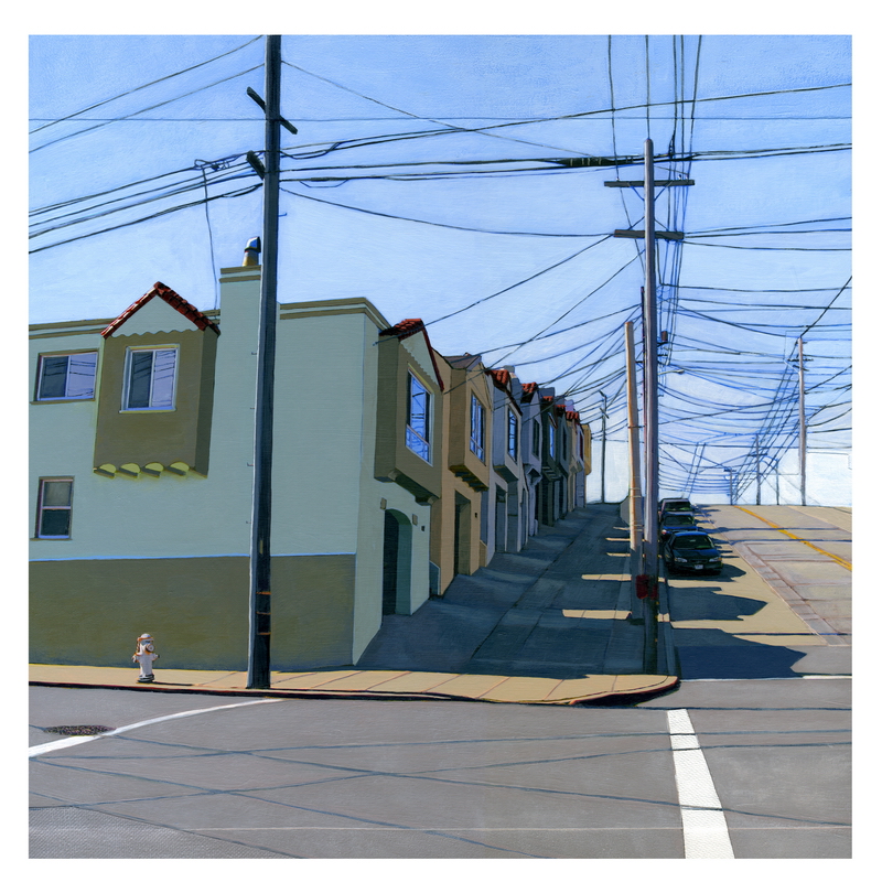 After receiving her BFA from Massachusetts College of Art in 1997, Leah made her living as an interactive designer and art director in Boston for over ten years, painting only periodically. Thanks in great part to the audience she's found through various online art sites, she has been able to paint almost full time since the spring of 2008. Her current body of work falls somewhere between the worlds of photography, painting and collage. She begins her pieces with photographs of seemingly ordinary and mundane scenes, which she then paints directly upon to distill and reveal the visually poignant moments that exist all around us, but are usually overlooked. Despite all the suburban scenes and mid-century modern design in her work, she was actually raised by artists deep in the woods of NH and now lives and works on the top floor of a sunny triple-decker apartment in Boston.