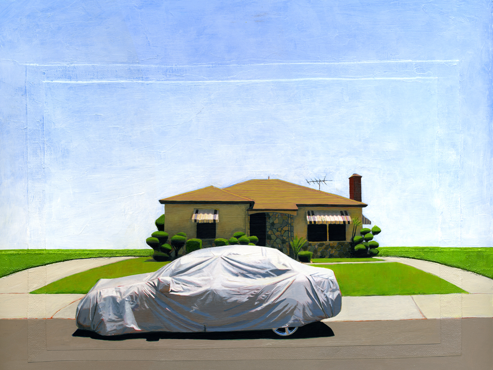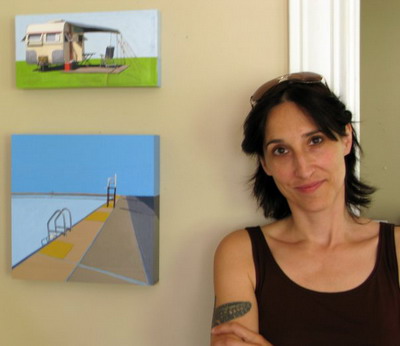 After receiving her BFA from Massachusetts College of Art in 1997, Leah made her living as an interactive designer and art director in Boston for over ten years, painting only periodically. Thanks in great part to the audience she's found through various online art sites, she has been able to paint almost full time since the spring of 2008. Her current body of work falls somewhere between the worlds of photography, painting and collage. She begins her pieces with photographs of seemingly ordinary and mundane scenes, which she then paints directly upon to distill and reveal the visually poignant moments that exist all around us, but are usually overlooked. Despite all the suburban scenes and mid-century modern design in her work, she was actually raised by artists deep in the woods of NH and now lives and works on the top floor of a sunny triple-decker apartment in Boston.