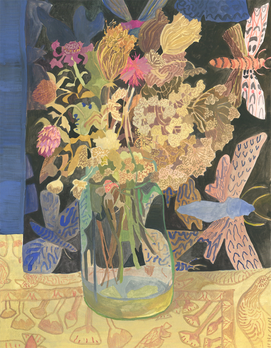 Michelle Morin lives and works in southern Maine. She studied painting and art history at Massachusetts College of Art. Through her work, she seeks out a balance within the complex and mesmerizing layers in nature, honing in on shape, line, and color. She is drawn to the close up wild-tangle contrasted by the softer patterns of distant perspectives in the natural world. Her paintings range from elaborate watercolor and gouache compositions on paper to vast and more layered paintings on panel.