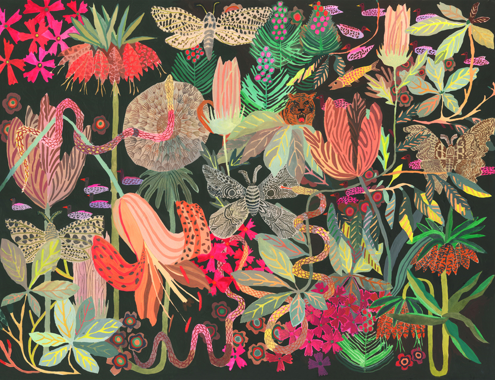 Michelle Morin lives and works in southern Maine. She studied painting and art history at Massachusetts College of Art. Through her work, she seeks out a balance within the complex and mesmerizing layers in nature, honing in on shape, line, and color. She is drawn to the close up wild-tangle contrasted by the softer patterns of distant perspectives in the natural world. Her paintings range from elaborate watercolor and gouache compositions on paper to vast and more layered paintings on panel.