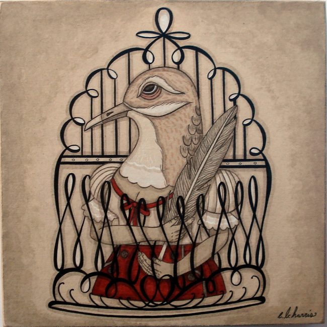 Born among the briars & brambles in backwoods of Medford, Oregon, Evan Benjamin Harris grew up with little knowledge of the bourgeois big city fine arts. So, he dove into the recesses of his own imagination and embraced the fables and folklore that fascinated him. With little to do but draw, he did exactly that. Now older, things haven’t changed much. The stories he created as a child are still present in his paintings. With diligence and hard work, Evan’s crude stick figures became the more clearly defined images you see today. With no formal art training, he creates on his own terms. Broken boards, oil and acrylic paints, charcoal pastels, plastic resign, and melted waxes are among the mediums Evan uses. Then they are beaten, brushed, sanded, polished, and hung. Most would cringe at the idea of scratching or sanding something they spent hours upon hours painting, but that’s Evan’s favorite part- creating the appearance that this wasn’t made in the 21st century, maybe in the 20th. So, behind every scratch and claw mark, there is a story to tell.