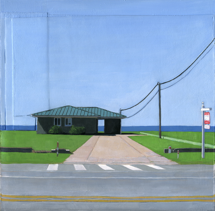After receiving her BFA from Massachusetts College of Art in 1997, Leah made her living as an interactive designer and art director in Boston for over ten years, painting only periodically. Thanks in great part to the audience she's found through various online art sites, she has been able to paint almost full time since the spring of 2008. Her current body of work falls somewhere between the worlds of photography, painting and collage. She begins her pieces with photographs of seemingly ordinary and mundane scenes, which she then paints directly upon to distill and reveal the visually poignant moments that exist all around us, but are usually overlooked. Despite all the suburban scenes and mid-century modern design in her work, she was actually raised by artists deep in the woods of NH and now lives and works on the top floor of a sunny triple-decker apartment in Boston.