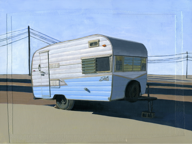 After receiving her BFA from Massachusetts College of Art in 1997, Leah made her living as an interactive designer and art director in Boston for over ten years, painting only periodically. Thanks in great part to the audience she's found through various online art sites, she has been able to paint almost full time since the spring of 2008. Her current body of work falls somewhere between the worlds of photography, painting and collage. She begins her pieces with photographs of seemingly ordinary and mundane scenes, which she then paints directly upon to distill and reveal the visually poignant moments that exist all around us, but are usually overlooked. Despite all the suburban scenes and mid-century modern design in her work, she was actually raised by artists deep in the woods of NH and now lives and works on the top floor of a sunny triple-decker apartment in Boston.